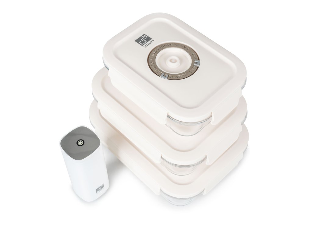- Kompletní set – vakuovací pumpa a dózy s objemem 630, 1 040 a 1 480 ml