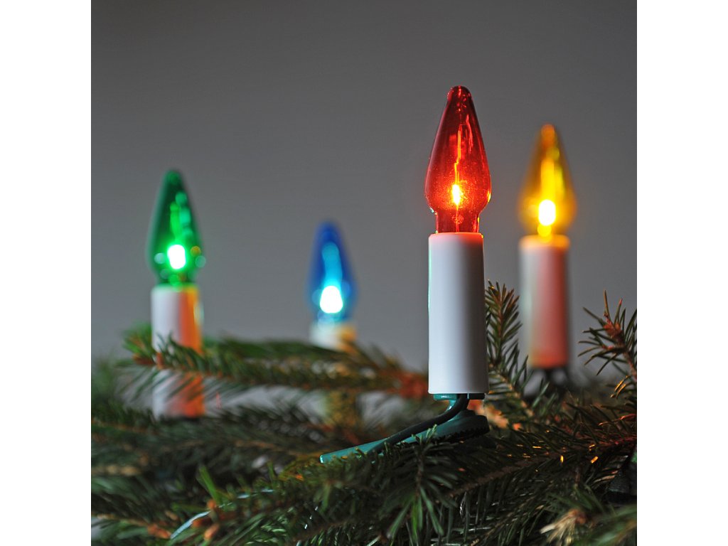Tradiční české skleněné žárovky ruční výroby FELICIA barevná, 16 žárovek x 14V/0,1A- délka řetězu 10,5 m