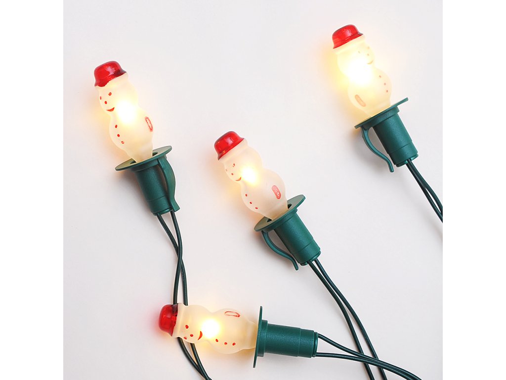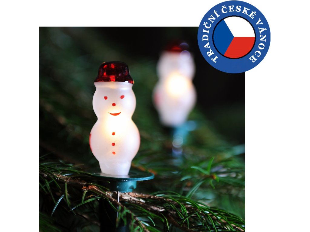 Tradiční skleněné žárovky ruční výroby FIGURKA sněhulák bílý, 12 žárovek x 20V/0,1A- délka řetězu 7,7 m