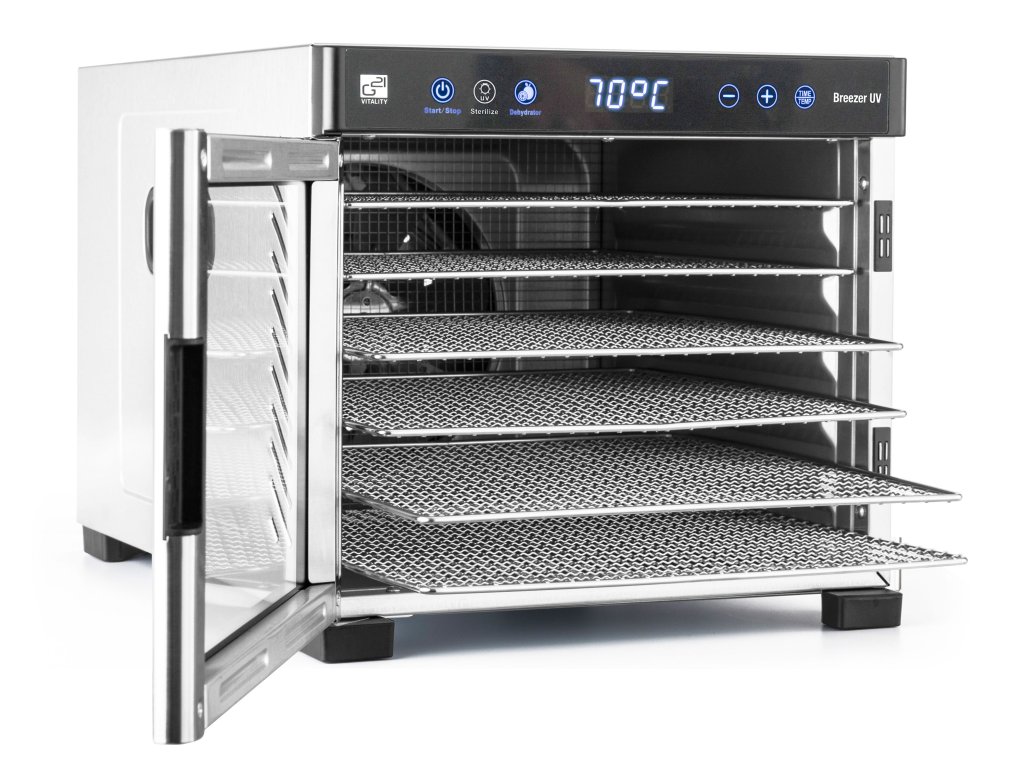 Řídící jednotka sušičky G21 Breezer má dokonale řešenou elektroniku, ovládání je intuitivní a snadné. Časovač hlídá dobu přípravy a po skončení sušení sušičku sám vypne. Regulátor teploty vám dává absolutní kontrolu nad sušícím procesem. Usušte si to, co chcete, přesně tak, jak to chcete.