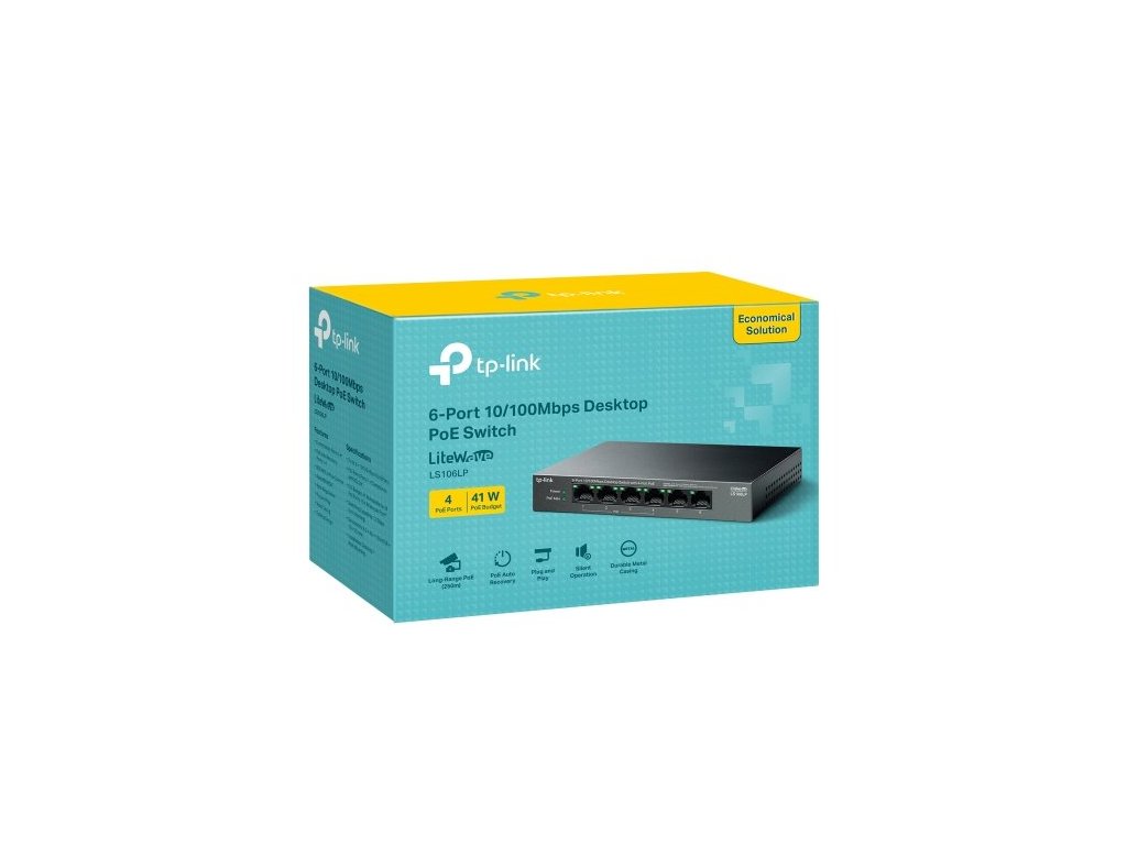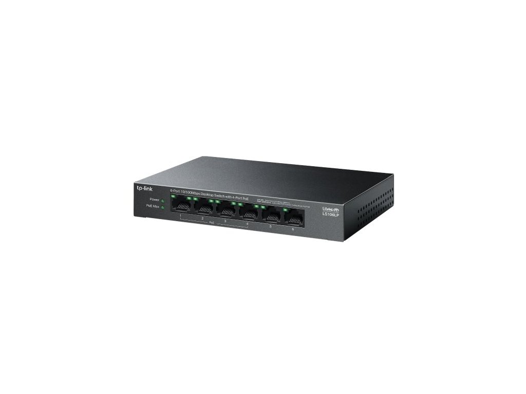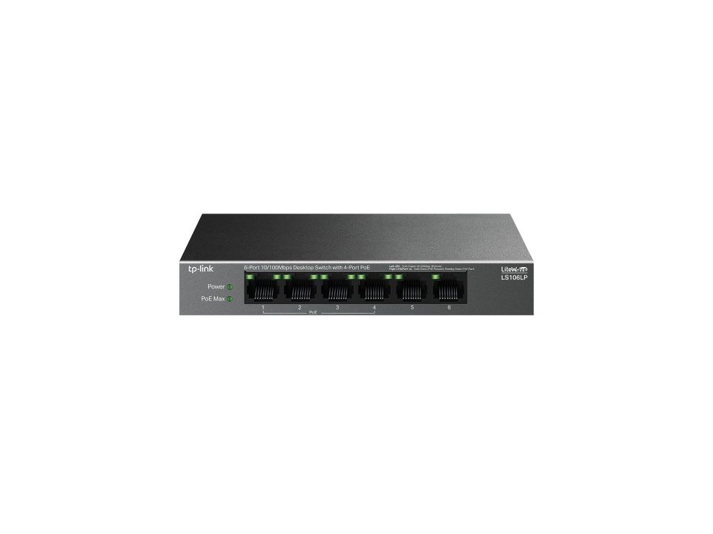 Switch TP-Link LS106LP je vybavený celkem šesti 10/100 Mbps LAN porty. Z toho má 4 PoE+ porty, které jsou kompatibilní se standardem 802.3af. Pomocí kabelu současně přenášíte data a napájíte zařízení s výkonem 15,4 W na každý PoE port. Celkový výkon dosahuje hodnoty až 41 W. Switch tedy snadno připojíte k IP kamerám, přístupovým bodům, IP telefonům a dalším zařízením.