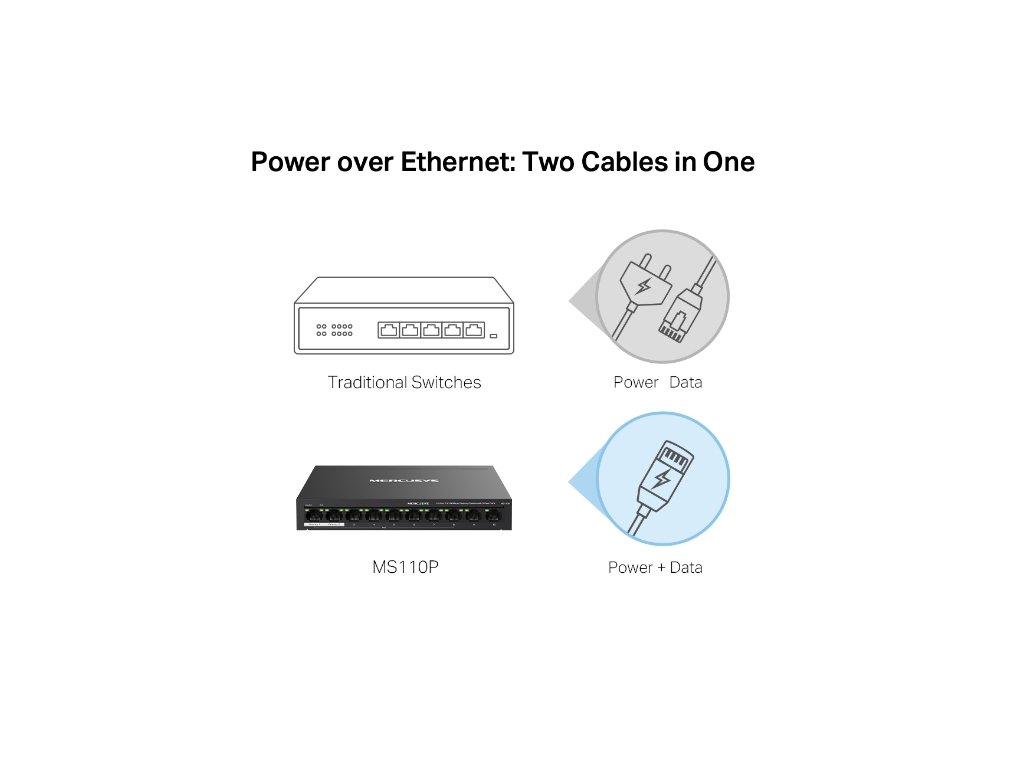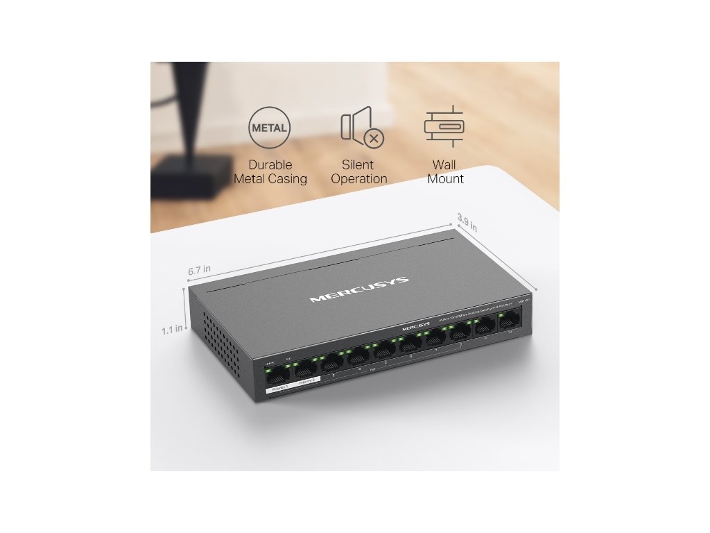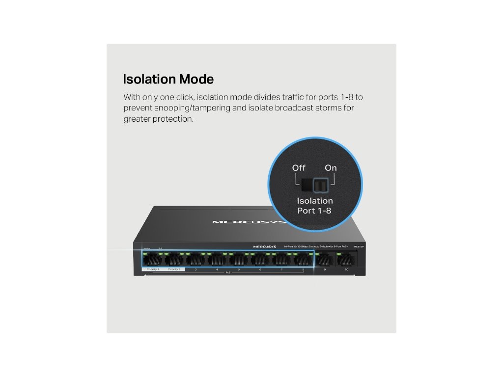 Se switchem Mercusys MS110P od TP-Link získáte stabilní připojení, které se hodí hlavně v menších firmách, ubytovnách nebo kancelářích. Poskytne vám 10 portů 10/100 Mbps, z nichž 8 umožňuje připojení PoE+. Zbylé 2 uplink porty slouží v režimu izolace pro připojení k internetu a NVR. K napájení a přenosu dat vám postačí jeden ethernetový kabel.