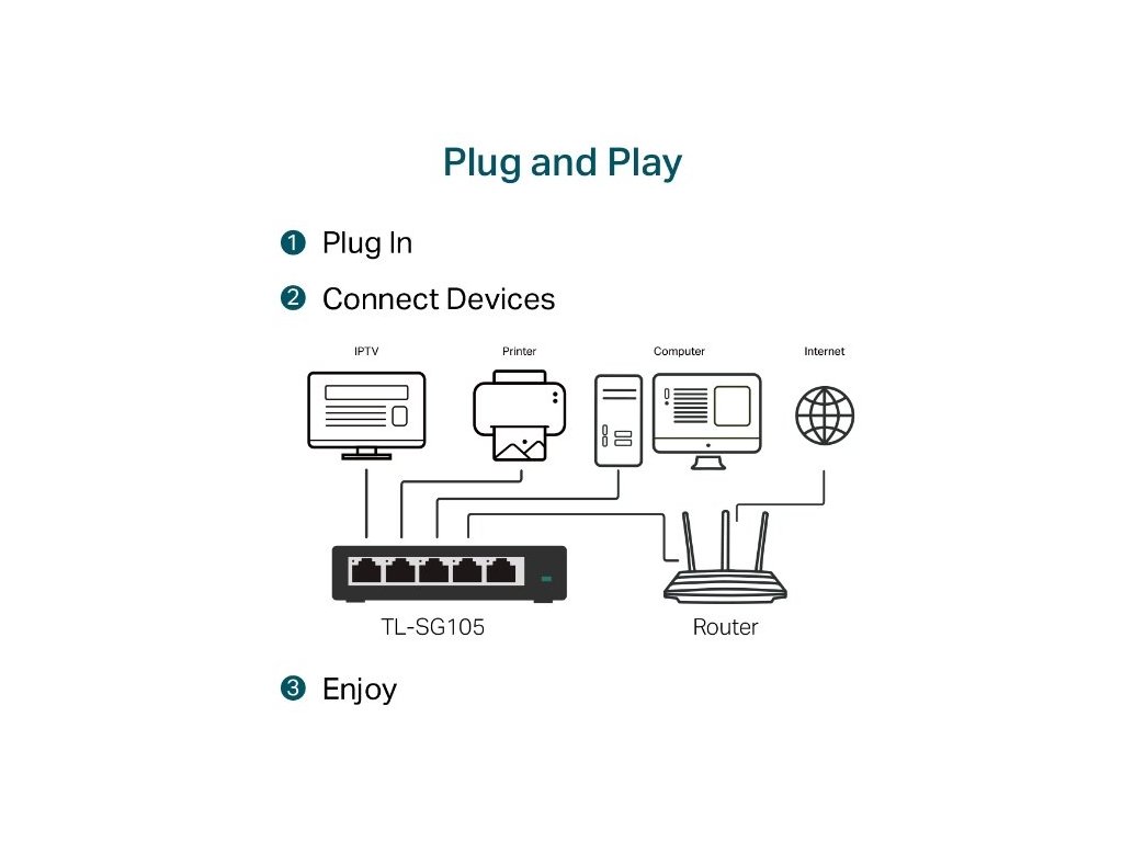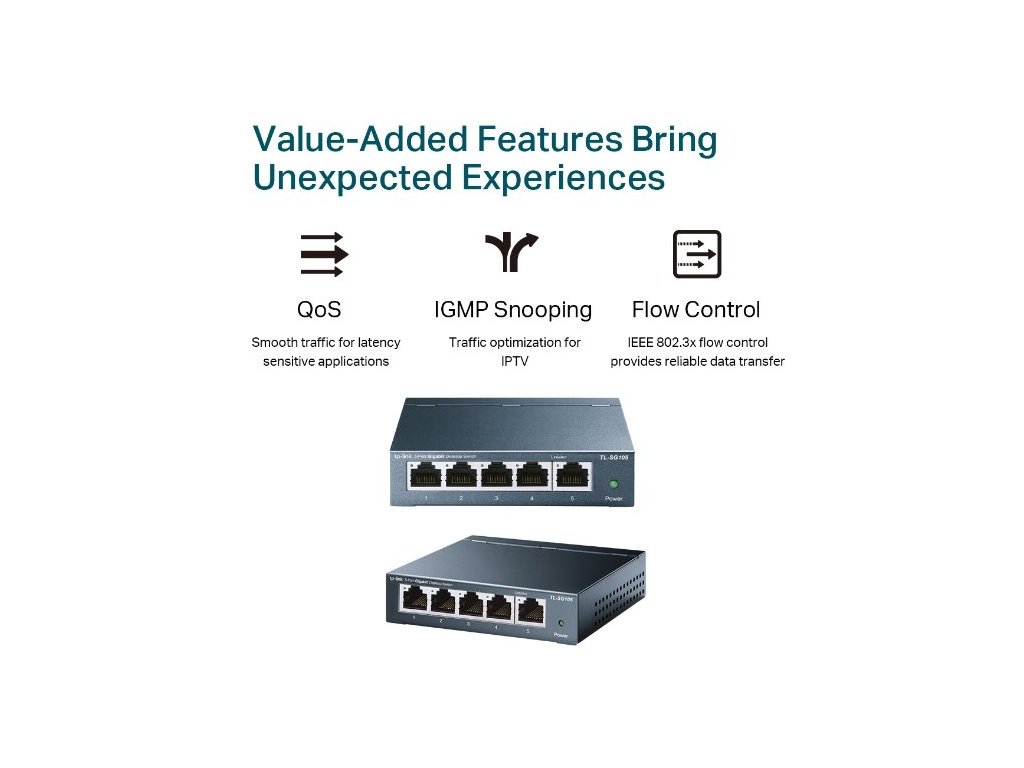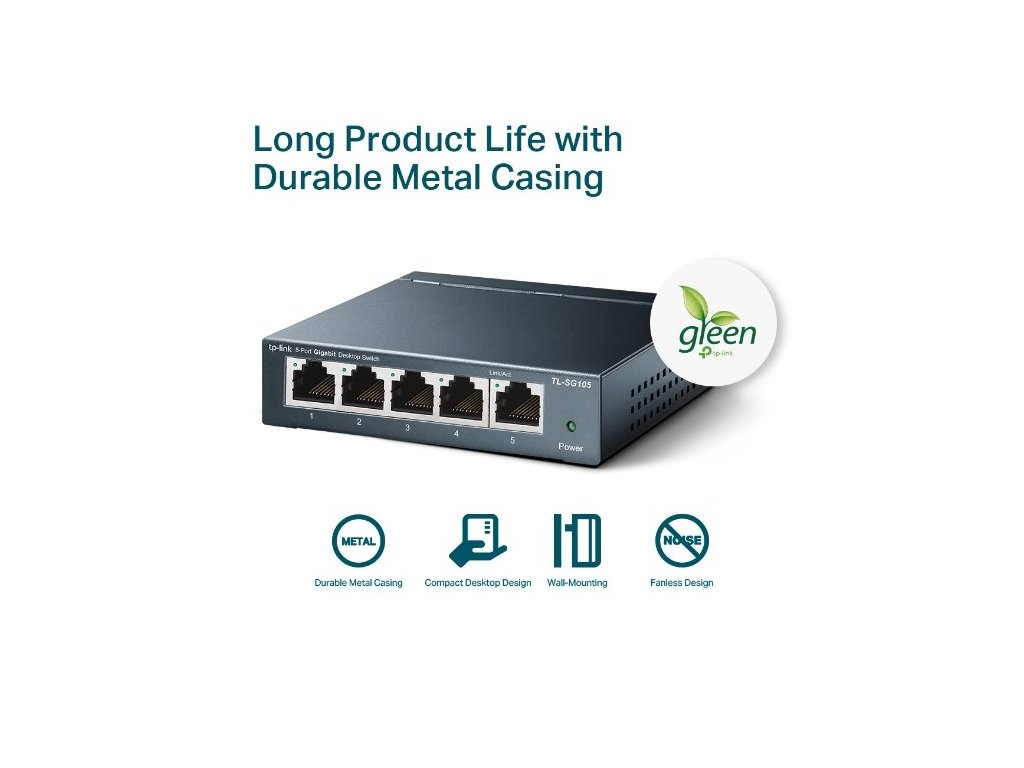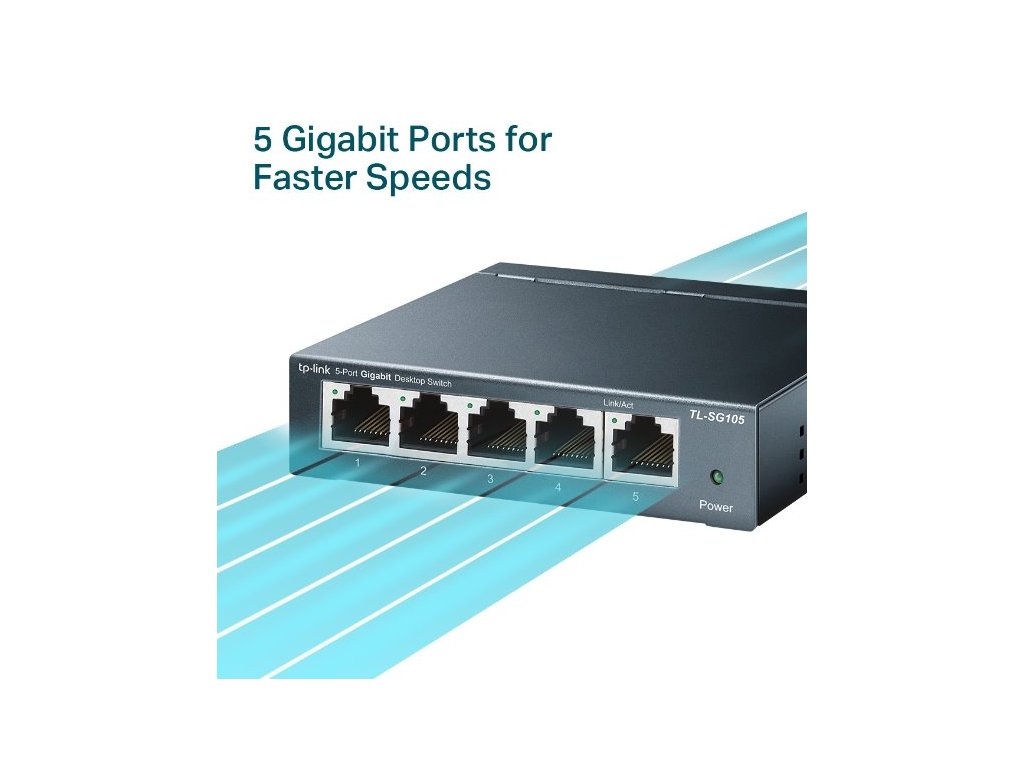 TP-Link TL-SG105 je vysokorychlostní gigabitový stolní switch v kovovém těle, který je ideálním řešením pro pracovní skupiny. Obsahuje 5x 10/100/1000BASE-T gigabitový Ethernet port s AUTO-MDIX s maximální rychlost 2000 Mbps ve full duplex modu a LED indikátory zobrazují instalaci kabelů a diagnostiku.Parametry: