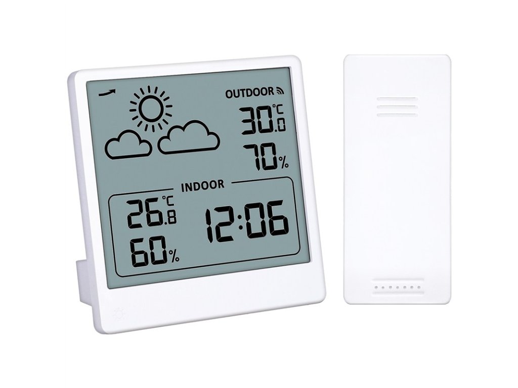 teploměr • vnitřní teplota • venkovní teplota • venkovní vlhkost • vnitřní vlhkost • hodiny • 1 ks senzory • dosah až 40 m • baterie AAA