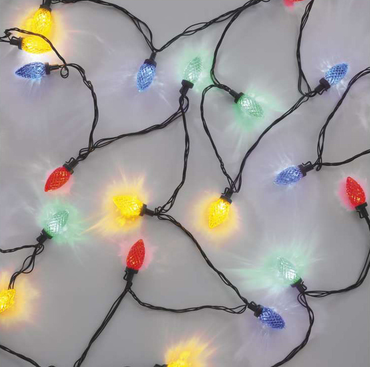 LED světelný řetěz • RGB barvy • délka 9,8 m • 8 režimů svícení • tvar svíčky • použití uvnitř i venku • napájení síťovým adaptérem • 50× LED • vzdálenost mezi žárovkami 20 cm • 5m přívod • příkon 6 W • krytí IP44 • životnost 10 000 hodin