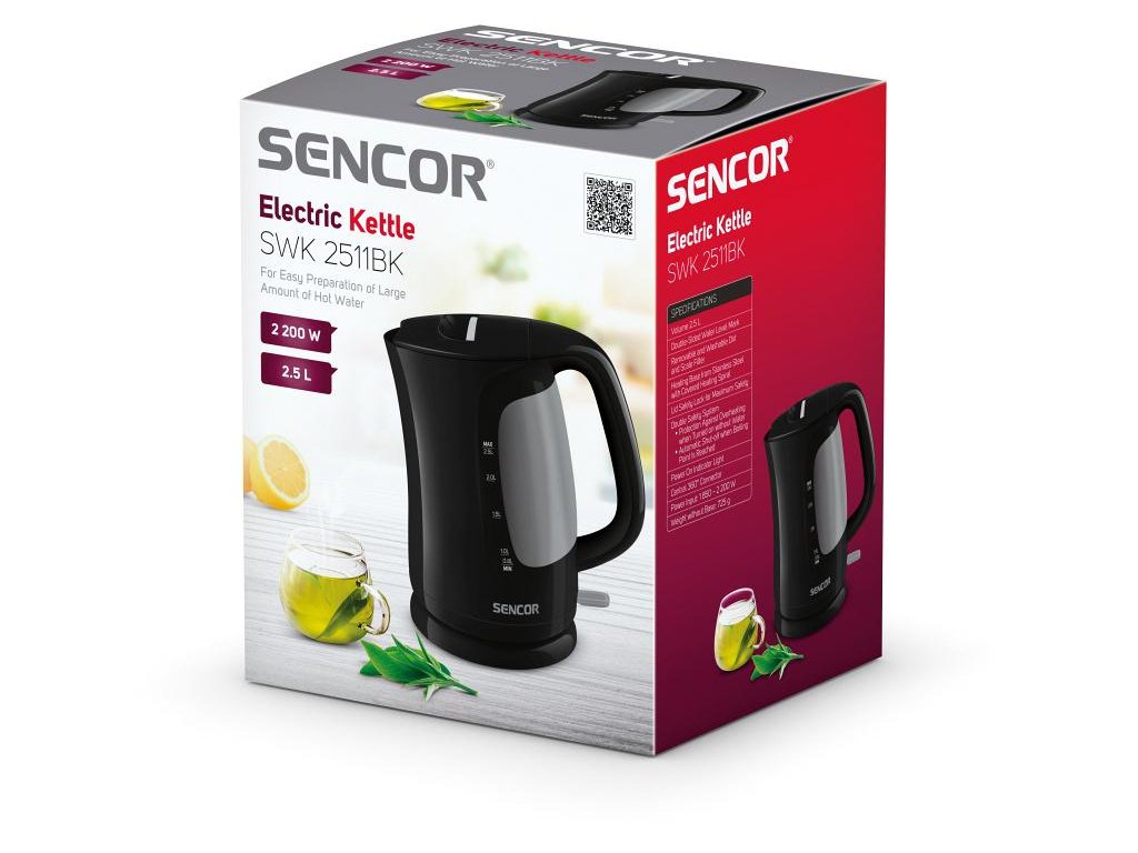 Výrobek Sencor vyniká výkonem 2 200 wattů, což zajistí, že bude voda připravená během pár minut. Při nalévání tekutiny do šálku přijde vhod bezpečností zámek na víku. Krom toho je konvice vybavena funkcí automatického vypnutí při dosažení bodu varu či v případě, že ji zapnete aniž by v ní byla voda. Precizní čištění zajistí vyjímatelný filtr proti vodnímu kameni.