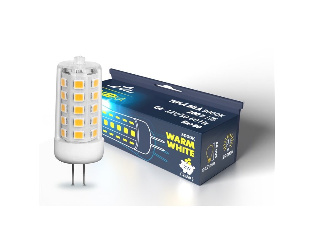 EKO LEDka, 2W LED žárovka, G4, 200 Lm, teplá bílá 3000K, 120°, alternativa klasické 21W žárovky
