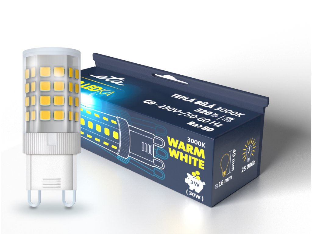 EKO LEDka, 3W LED žárovka, G9, 320 Lm, teplá bílá 3000K, 120°, alternativa klasické 30W žárovky