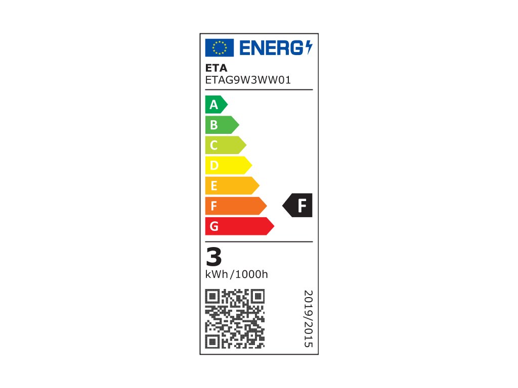 EKO LEDka (ETAG9W3WW01) je 3W LED žárovka s paticí G9 a vstupním napětí 230V. Světelný tok žárovky je 320 Lm s úhlem svítivosti 120°. Její světlo řadíme mezi teplé bílé (o síle 3000K) a je alternativou klasické 30W žárovky. Rozměry žárovky jsou 49x16 mm.