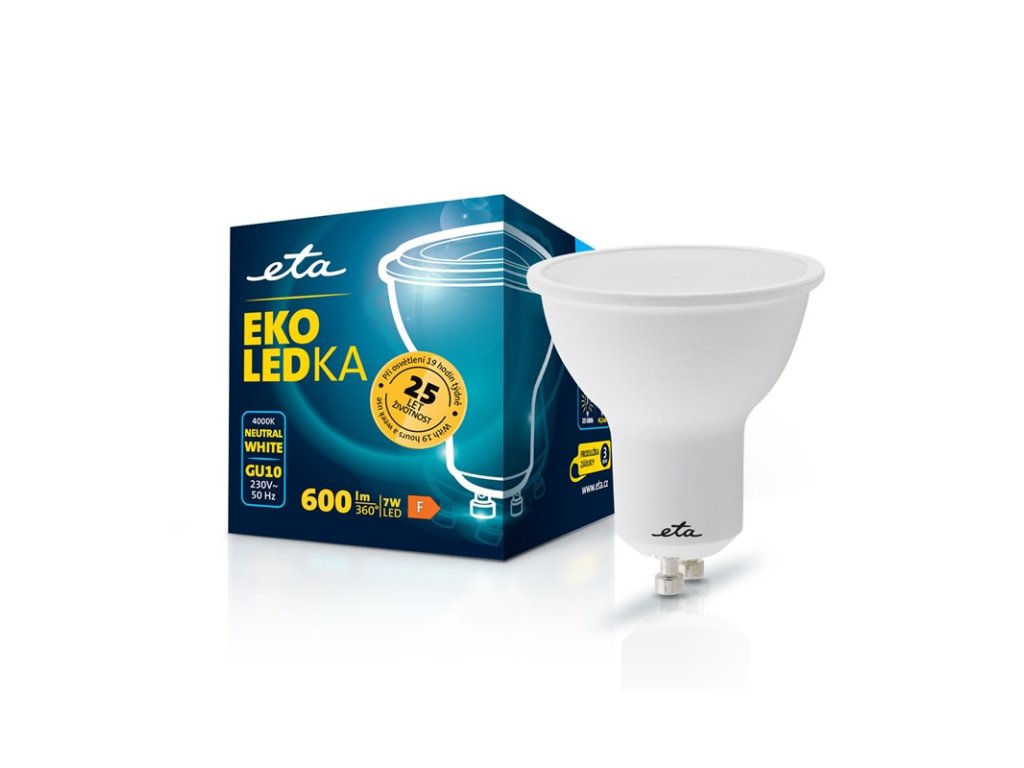 EKO LEDka (ETAGU10W7NW01) je mléčná 7W LED žárovka s paticí GU10 a vstupním napětí 230V. Světelný tok žárovky je 600 Lm s úhlem svítivosti 360°. Její světlo řadíme mezi neutrální bílé (o teplotě 4000K) a je alternativou klasické 48W žárovky. Rozměry žárovky jsou 50x54 mm.