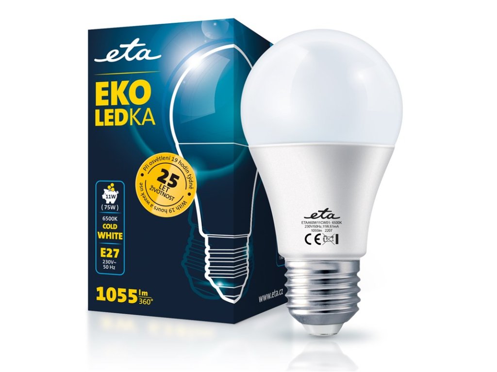 EKO LEDka (ETAA60W11CW01) je mléčná 11W LED žárovka s paticí E27 a vstupním napětí 230V. Světelný tok žárovky je 1055 Lm s úhlem svítivosti 360°. Její světlo řadíme mezi studené bílé (o síle 6500K) a je alternativou klasické 75W žárovky. Rozměry žárovky jsou 60x110 mm.