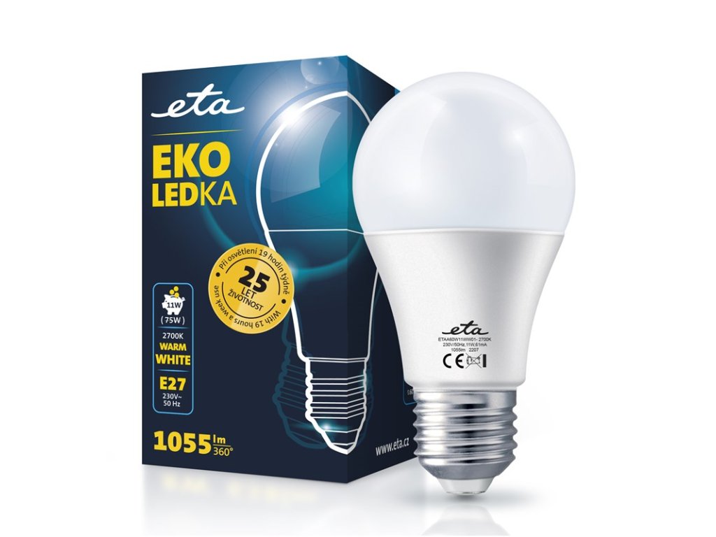 EKO LEDka (ETAA60W11WW01) je mléčná 11W LED žárovka s paticí E27 a vstupním napětí 230V. Světelný tok žárovky je 1055 Lm s úhlem svítivosti 360°. Její světlo řadíme mezi teplé bílé (o síle 2700K) a je alternativou klasické 75W žárovky. Rozměry žárovky jsou 60x110 mm.