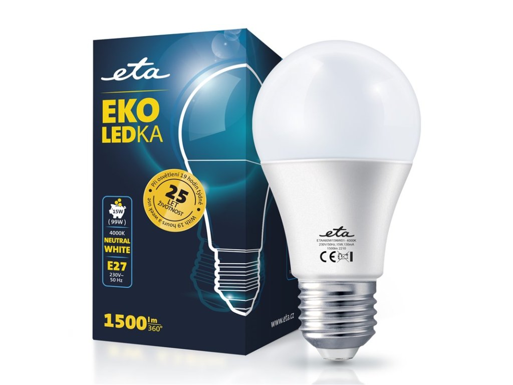 EKO LEDka (ETAA60W15NW01) je mléčná 15W LED žárovka s paticí E27 a vstupním napětí 230V. Světelný tok žárovky je 1500 Lm s úhlem svítivosti 360°. Její světlo řadíme mezi neutrální bílé (o síle 4000K) a je alternativou klasické 99W žárovky. Rozměry žárovky jsou 60x123 mm.