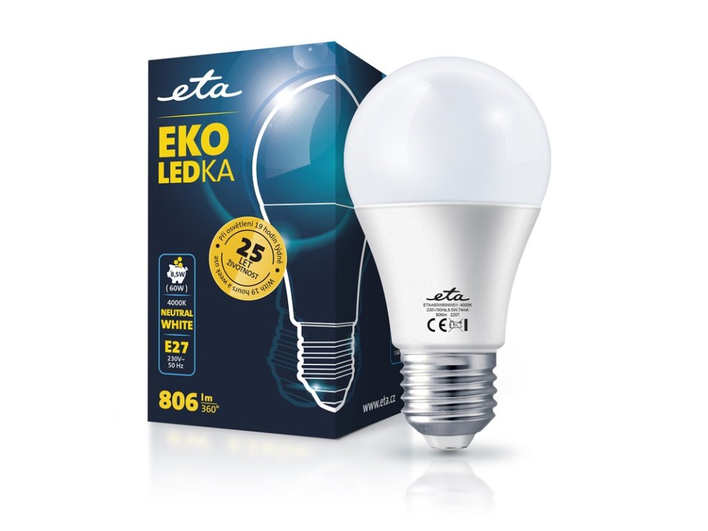 EKO LEDka (ETAA60W85NW01) je mléčná 8,5W LED žárovka s paticí E27 a vstupním napětí 230V. Světelný tok žárovky je 806 Lm s úhlem svítivosti 360°. Její světlo řadíme mezi neutrální bílé (o síle 4000K) a je alternativou klasické 60W žárovky. Rozměry žárovky jsou 60x110 mm.