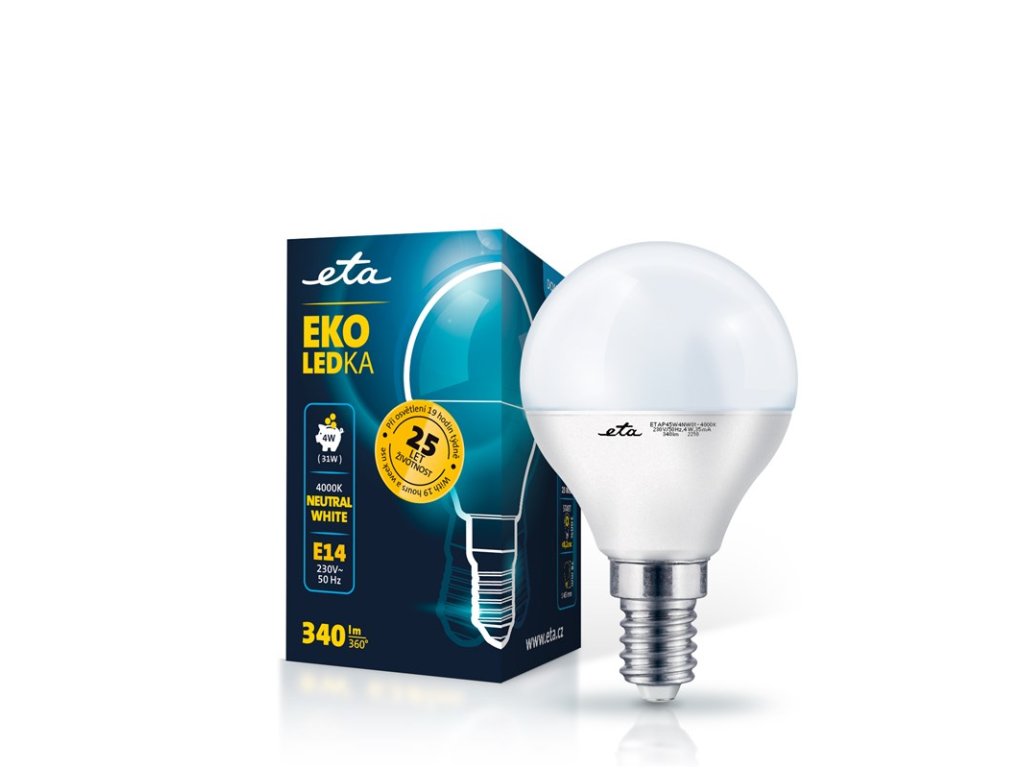 EKO LEDka (ETAP45W4NW01) je mléčná 4W LED žárovka s paticí E14 a vstupním napětí 230V. Světelný tok žárovky je 340 Lm s úhlem svítivosti 360°. Její světlo řadíme mezi neutrální bílé (o teplotě 4000K) a je alternativou klasické 31W žárovky. Rozměry žárovky jsou 45x78 mm.