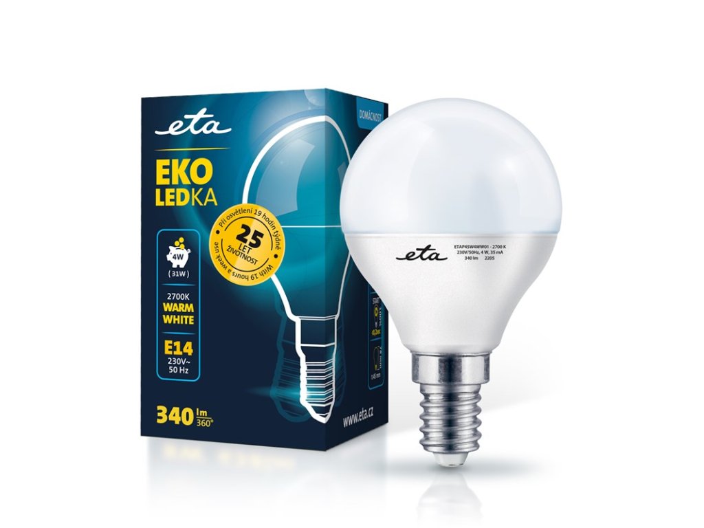 LED žárovky ETA jsou spolehlivým a úsporný zdrojem energie do každé domácnosti. Nejen, že oproti klasické žárovce ušetříte až 90 % spotřeby energie, ale vydrží vám svítit až 30 000 hodin (cca 15 let).