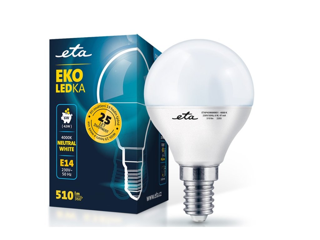 LED žárovky ETA jsou spolehlivým a úsporný zdrojem energie do každé domácnosti. Nejen, že oproti klasické žárovce ušetříte až 90 % spotřeby energie, ale vydrží vám svítit až 30 000 hodin (cca 15 let).