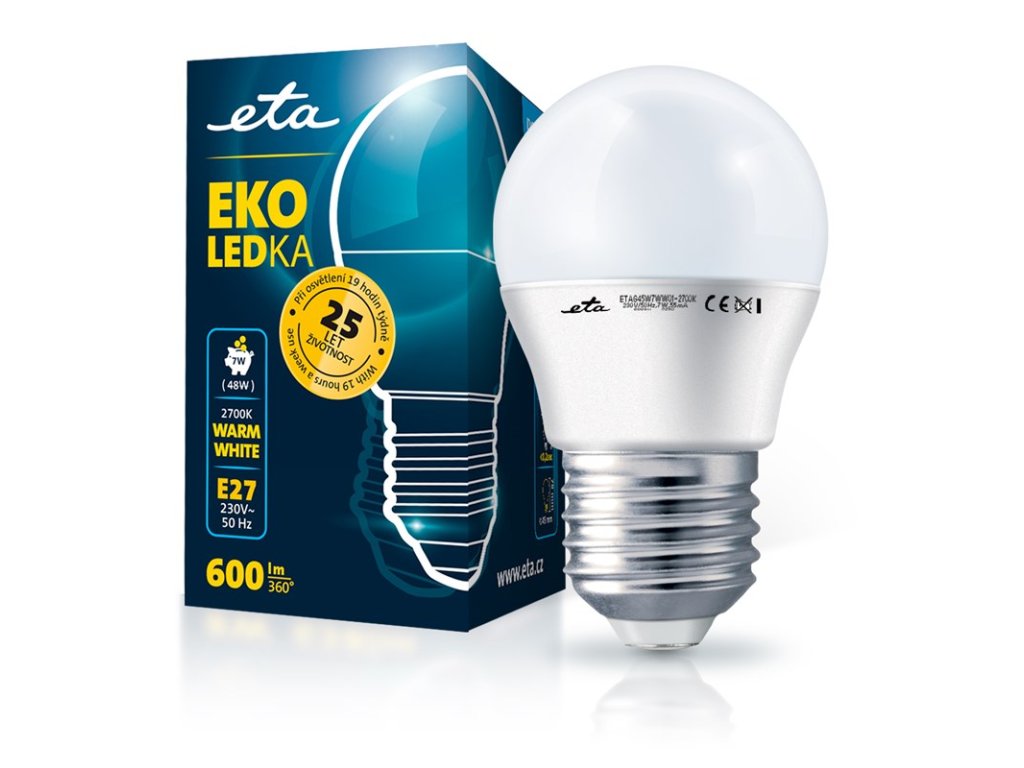 EKO LEDka (ETAG45W7WW01) je mléčná 7W LED žárovka s paticí E27 a vstupním napětí 230V. Světelný tok žárovky je 600 Lm s úhlem svítivosti 360°. Její světlo řadíme mezi teplé bílé (o teplotě 2700K) a je alternativou klasické 48W žárovky. Rozměry žárovky jsou 45x82 mm.