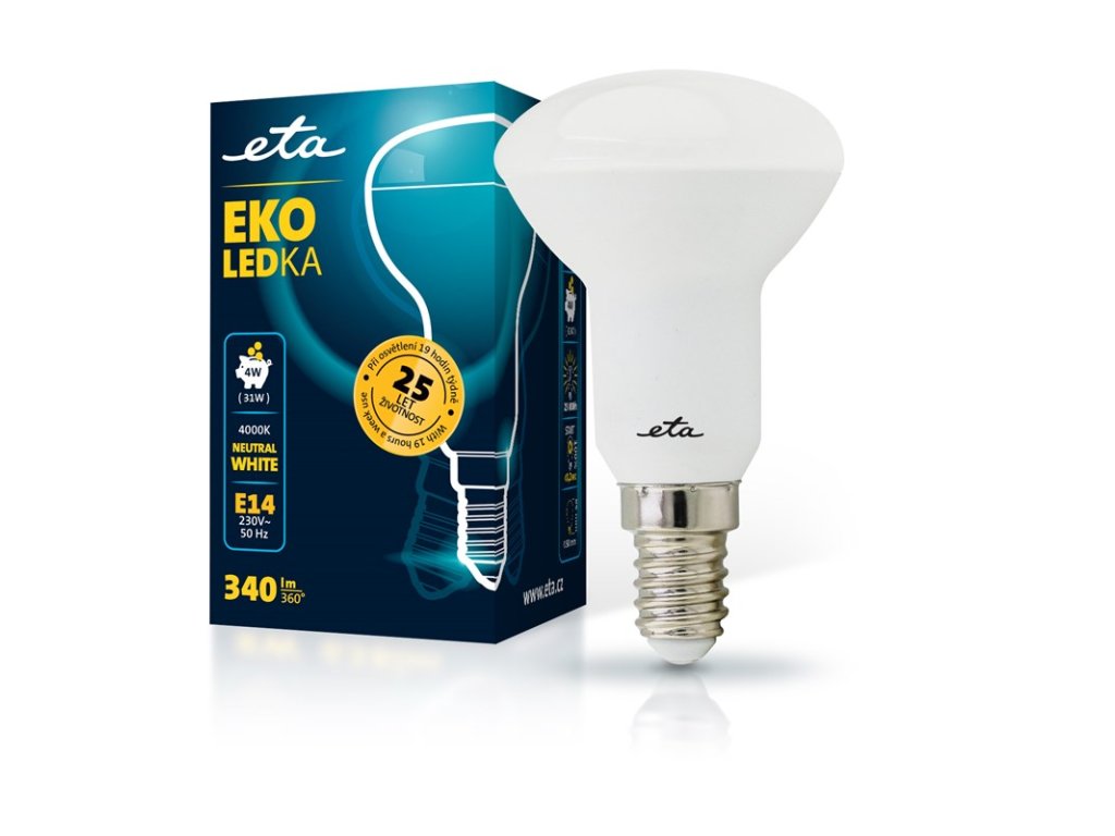 EKO LEDka (ETAR50W4NW01) je mléčná 4W LED žárovka s paticí E14 a vstupním napětí 230V. Světelný tok žárovky je 340 Lm s úhlem svítivosti 360°. Její světlo řadíme mezi neutrální bílé (o teplotě 4000K) a je alternativou klasické 31W žárovky. Rozměry žárovky jsou 50x85 mm.