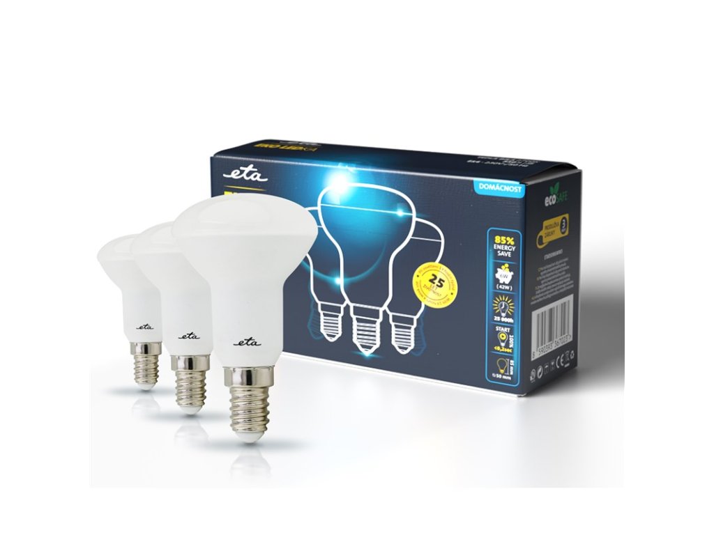 Multi pack 3 ks EKO LEDky (ETAR50W6WW3P) jsou mléčné 6W LED žárovky s paticí E14 a vstupním napětí 230V. Světelný tok každé žárovky je 510 Lm s úhlem svítivosti 360°. Jejich světlo řadíme mezi teplé bílé (o síle 2700K) a jsou alternativou klasické 42W žárovky. Rozměry každé žárovky jsou 50x85 mm.