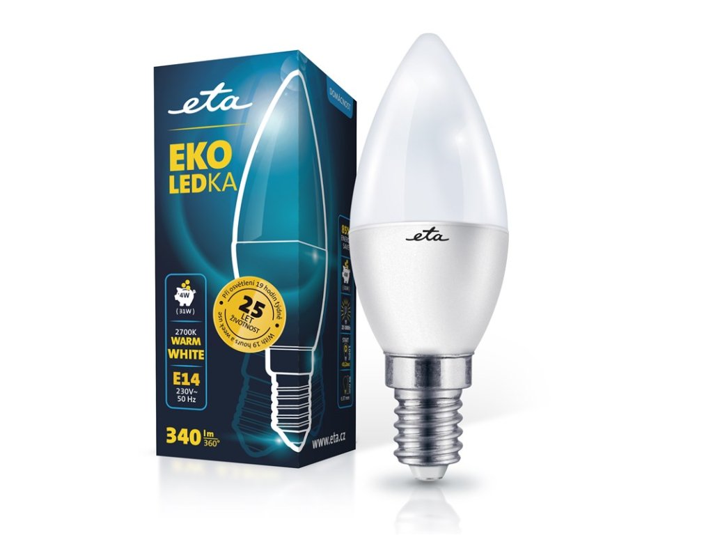 EKO LEDka (ETAC37W4WW01) je mléčná 4W LED žárovka s paticí E14 a vstupním napětí 230V. Světelný tok žárovky je 340 Lm s úhlem svítivosti 360°. Její světlo řadíme mezi teplé bílé (o síle 2700K) a je alternativou klasické 31W žárovky. Rozměry žárovky jsou 37x99 mm.