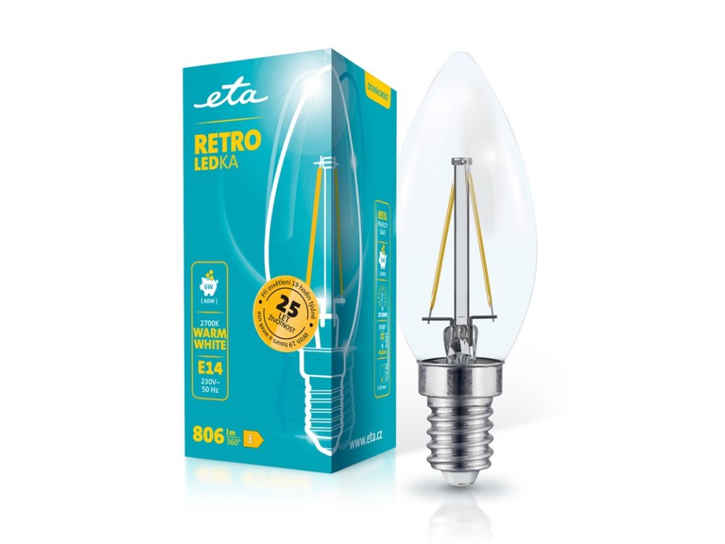 RETRO LEDka (ETAC35W6WWF01) je čirá 6W LED žárovka s paticí E14 a vstupním napětí 230V. Světelný tok žárovky je 806 Lm s úhlem svítivosti 360°. Její světlo řadíme mezi teplé bílé (o síle 2700K) a je alternativou klasické 75W žárovky. Rozměry žárovky jsou 35x98 mm.