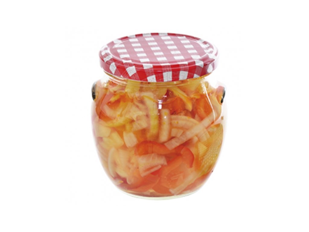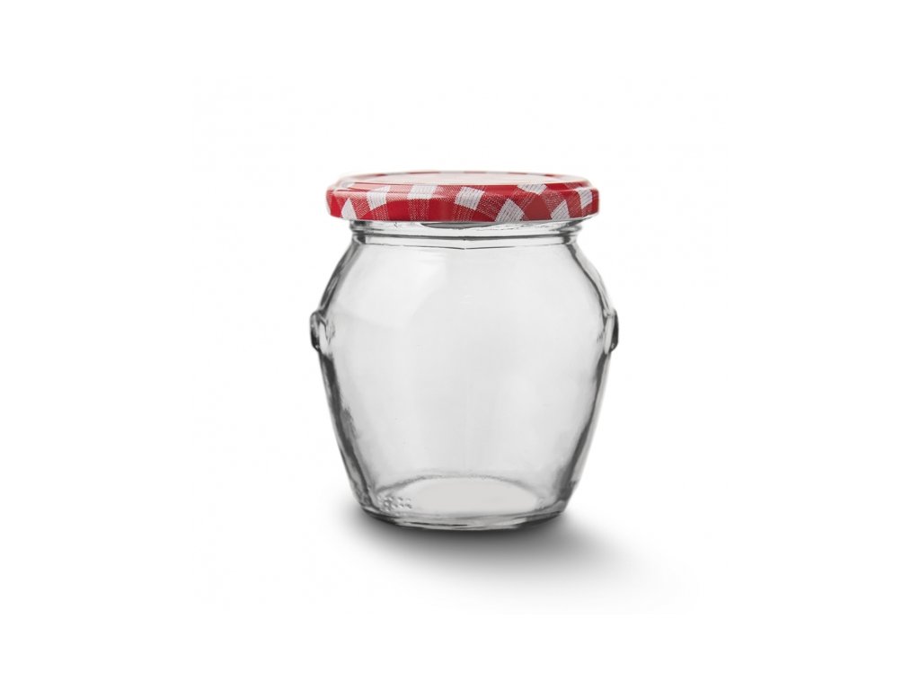 Sklenice s víčkem na zavařování ovoce, zeleniny, hub, čalamád nebo také na uskladnění sušeného ovoce, bylin, ořechů. Kovové víčko na závit - červenobílé kostky.