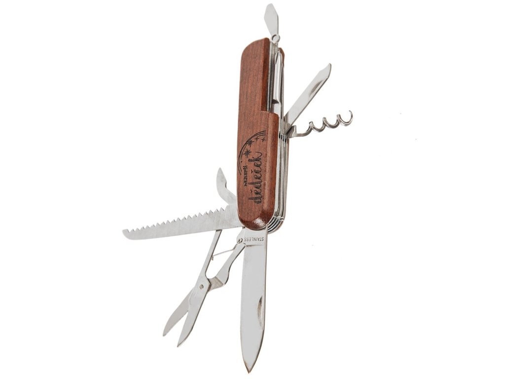Praktický zavírací nůž s devíti funkcemi z kolekce NEJLEPŠÍ DĚDEČEK... Má zdobenou dřevěnou rukojeť a obsahuje: nůž s hladkou čepelí, pilku na dřevo, nůžky, otvírák konzerv, křížový šroubovák, pilník, otvírák lahví se šroubovákem, vývrtku, výstružník a nerezový kroužek pro upevnění na klíče nebo karabinku. Materiál: nerezová ocel, dřevo. Možnost zavěšení. Rozměry: ve složeném stavu 9x2,5x2 cm, d. čepele 5,5 cm.Doplňkové parametry