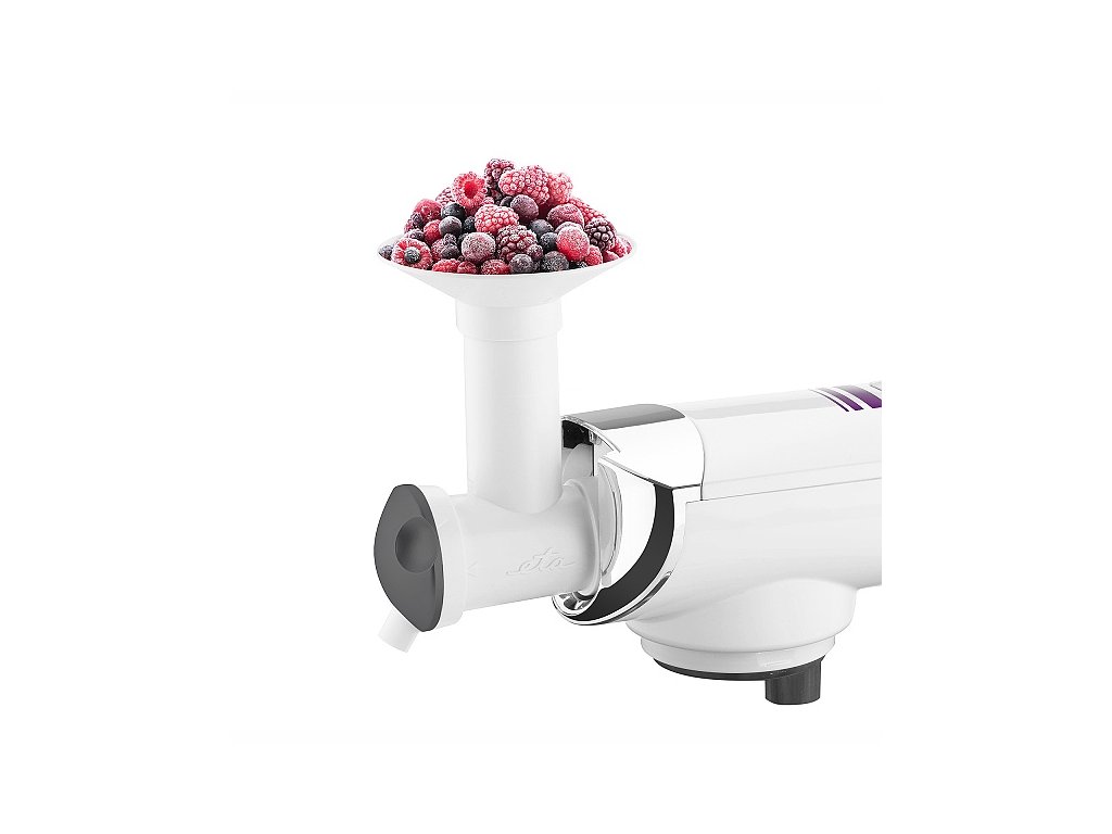 Sestavíte ho jednoduše a rychle. Jeho údržba je snadná díky kompletně rozebíratelnému mechanismu a jednotlivé díly můžete mýt i v myčce na nádobí. Zmrzlina bude mít velmi jemnou strukturu, díky 36 nerezovým nožům, které zpracovávají suroviny velmi šetrně. Plnící otvor umožňuje vkládat i větší kusy ovoce. Pomůžete si pěchovadlem, které posouvá suroviny směrem k noži k jejich rozmělnění.